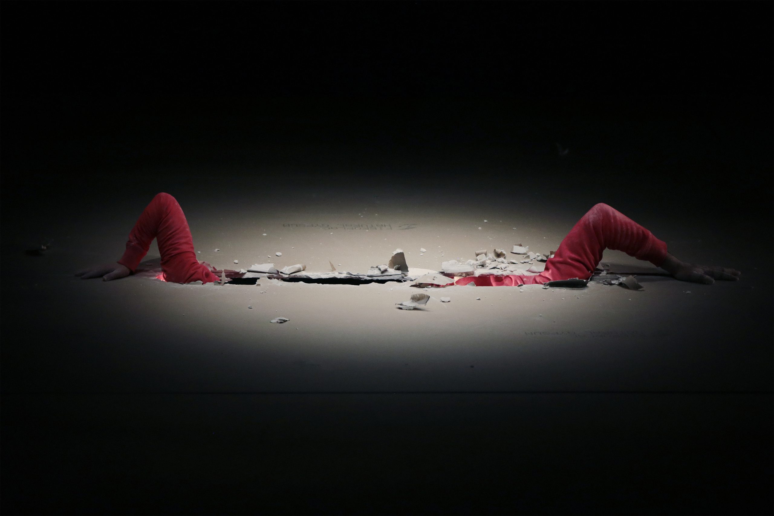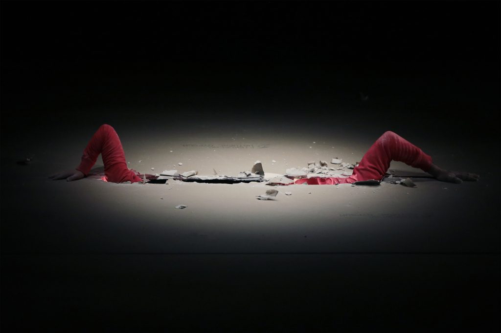 Quarta-Feira: O tempo das cerejas estreou em Junho, no Festival Alkantara 2018. O cenário é um enorme buraco no meio de uma data de placas de gesso laminado, como se uma bola de ferro gigante tivesse caído num chão de pladur. Ao construir o espaço cénico com o mesmo material de construção usado em milhares de casas portuguesas, para logo de seguida começar a desconstruir, Cláudia Dias e Igor Gandra fazem alusão direta a tudo o que é varrido para baixo do tapete ocidental. Apesar de os bombardeamentos aéreos por parte de forças militares europeias serem hoje em dia facilmente visionáveis na internet ou na TV, a ligação entre os nossos lares e as crateras abertas por mísseis noutro lado qualquer não é tão visível assim. Este buraco negro no meio do Teatro Maria Matos alude a essa ligação causal. Não se trata apenas de mostrar a responsabilidade das sociais-democracias europeias nos massacres que estão a ocorrer agora no resto do mundo. O olho negro no meio do chão é uma imagem de sinal negativo que nos revela o que está por fazer. Jorge Louraço Figueira