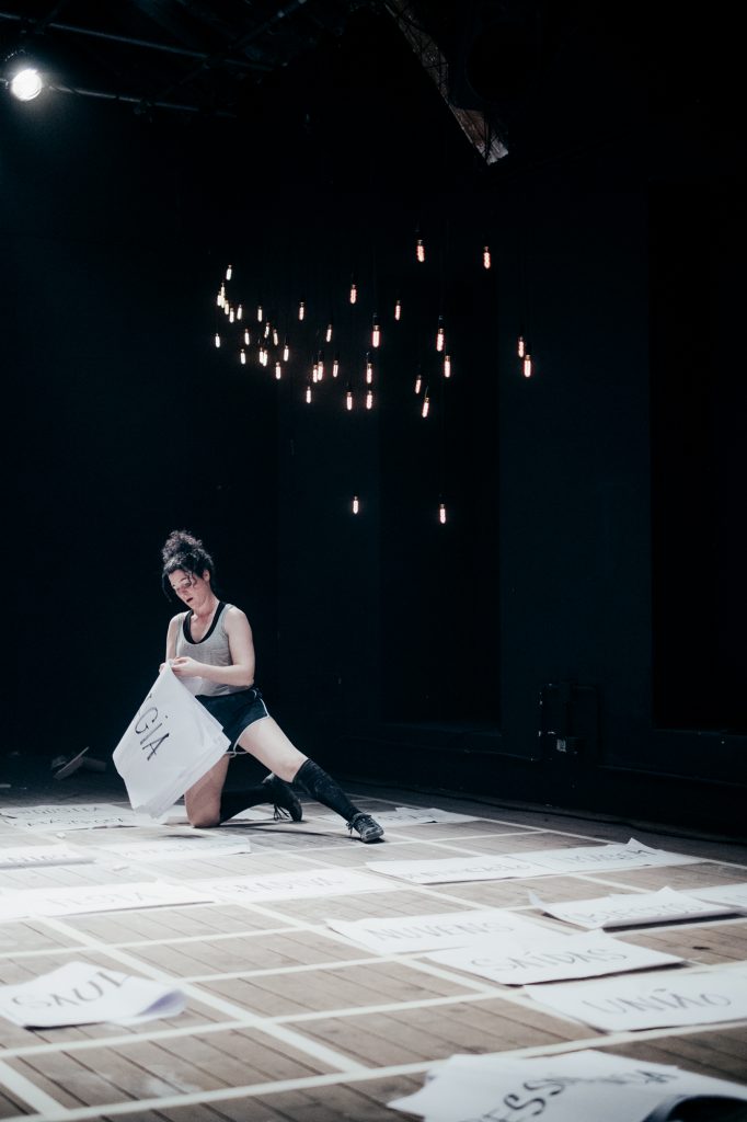 Projeto Paula Diogo | Cocriação Alfredo Martins | Interpretação Paula Diogo | Espaço cénico Fernando Ribeiro | Desenho de luz Daniel Worm | Música Gui Garrido | Apoio à dramaturgia Linda Dalisi | Produção Má-Criação | Apoio financeiro Fundação Calouste Gulbenkian, no âmbito do programa Gulbenkian de Língua e Culturas Portuguesas - Concurso de apoio à criação Parceiros ZDB / NEGÓCIO, O Espaço do Tempo e Alkantara