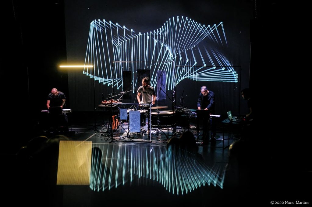 Percussão Gustavo Costa | Computador Miguel Carvalhais | Computador Pedro Tudela | Visuais Rodrigo Carvalho | Produção Sonoscopia
