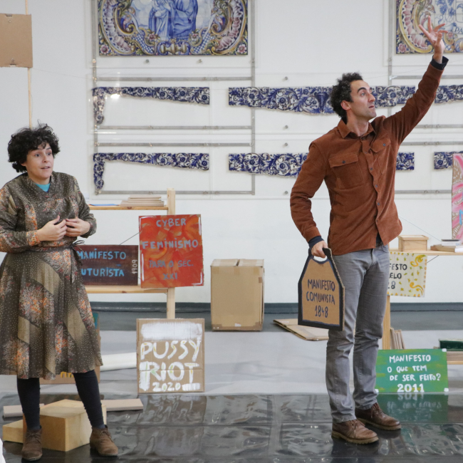 2 performers encontram-se numa biblioteca para conceberem um manifesto para o futuro. Ao relacionarem-se com os objetos e materiais que compõem esta biblioteca, procuram reconstruí-la, descobrindo palavras e vozes que pertencem a manifestos escritos no passado e que apontam para o futuro. De que forma é que as ideias expressas nestes manifestos poderão ajudar a criar um melhor presente e um melhor futuro?